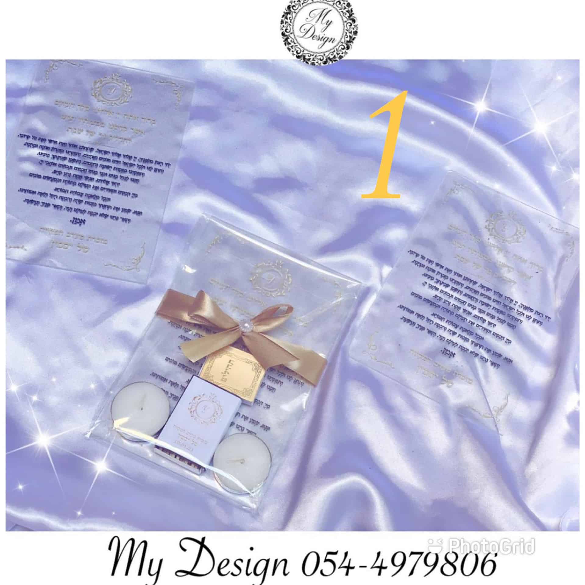 מארז שלישי- חבילת ברכון+נרות+גפרורים – ברכון שקוף עם הקדשה זוג נרות שבת וגפרורים ממותג בהתאמה לעיצוב הברכון ארוז בצלופן עם סרט (ניתן לבחור צבע)