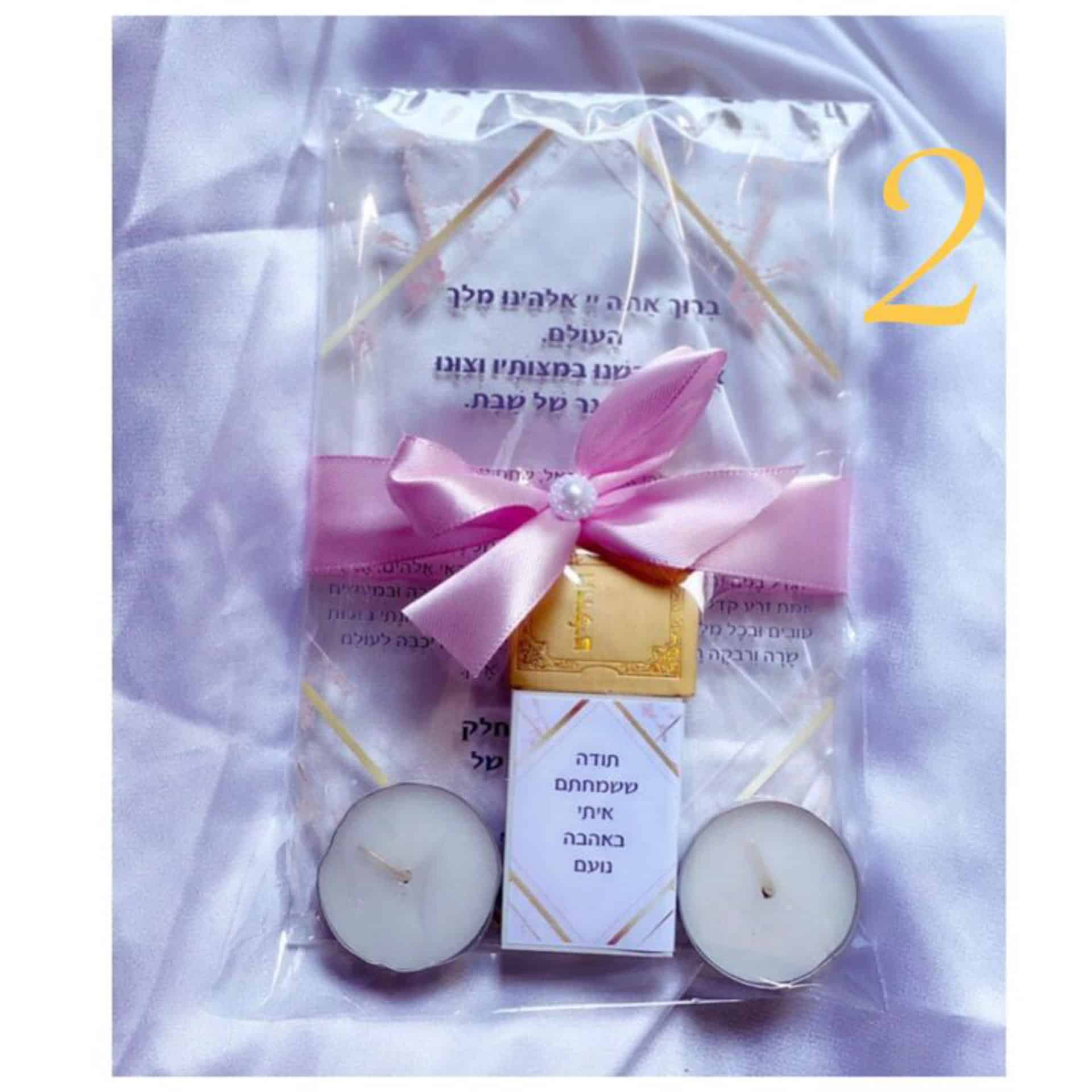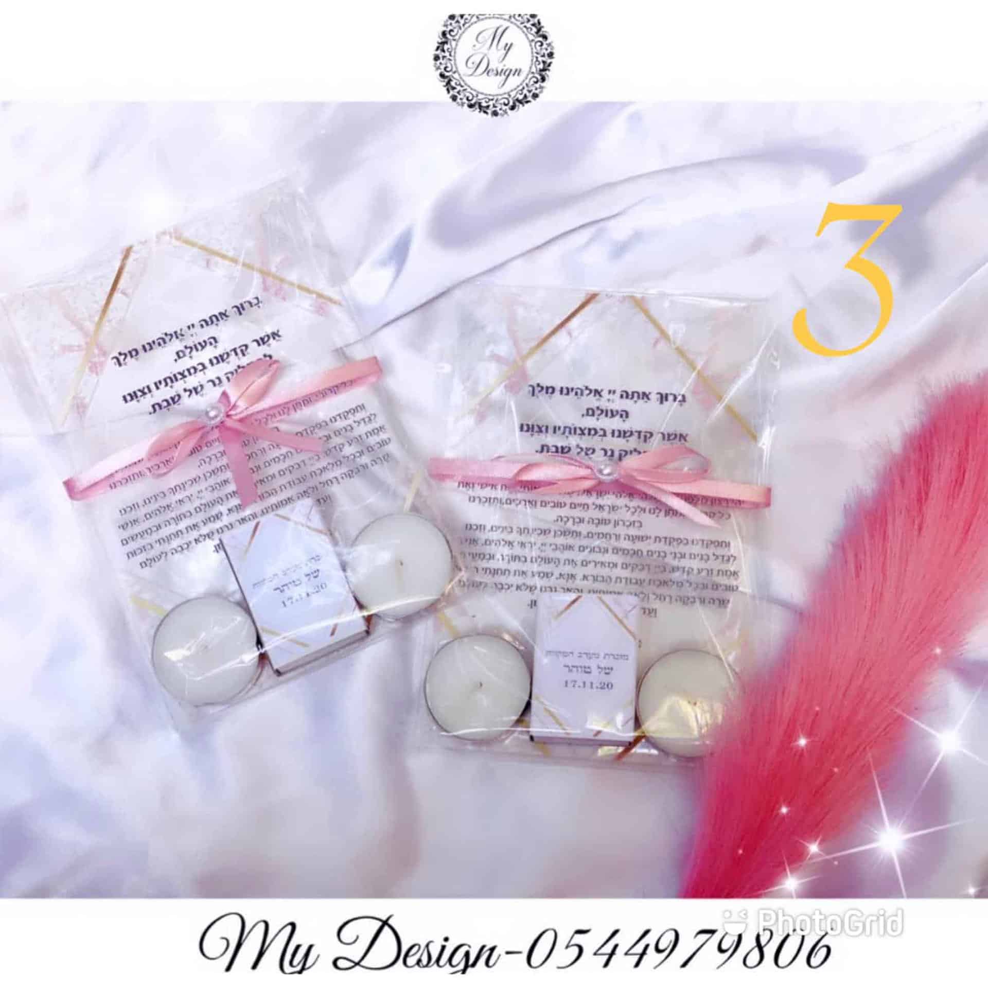 מארז שלישי- חבילת ברכון+נרות+גפרורים – ברכון שקוף עם הקדשה זוג נרות שבת וגפרורים ממותג בהתאמה לעיצוב הברכון ארוז בצלופן עם סרט (ניתן לבחור צבע)