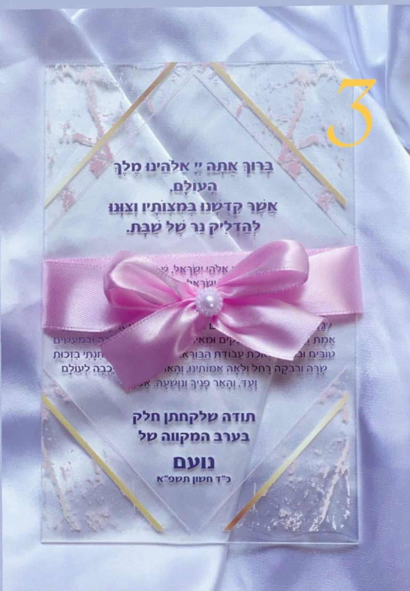 מארז ראשון : חבילת ברכון – ברכון שקוף עם הקדשה ארוז בצלופן עם סרט פפיון (ניתן לבחור צבע)