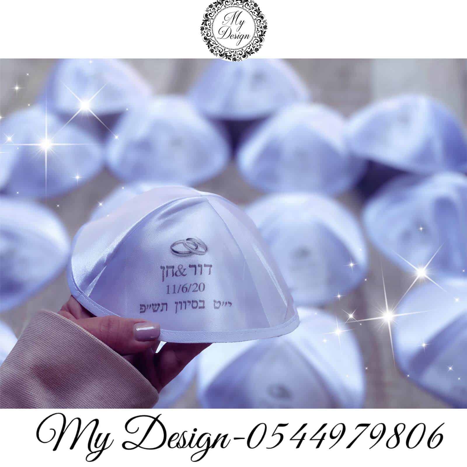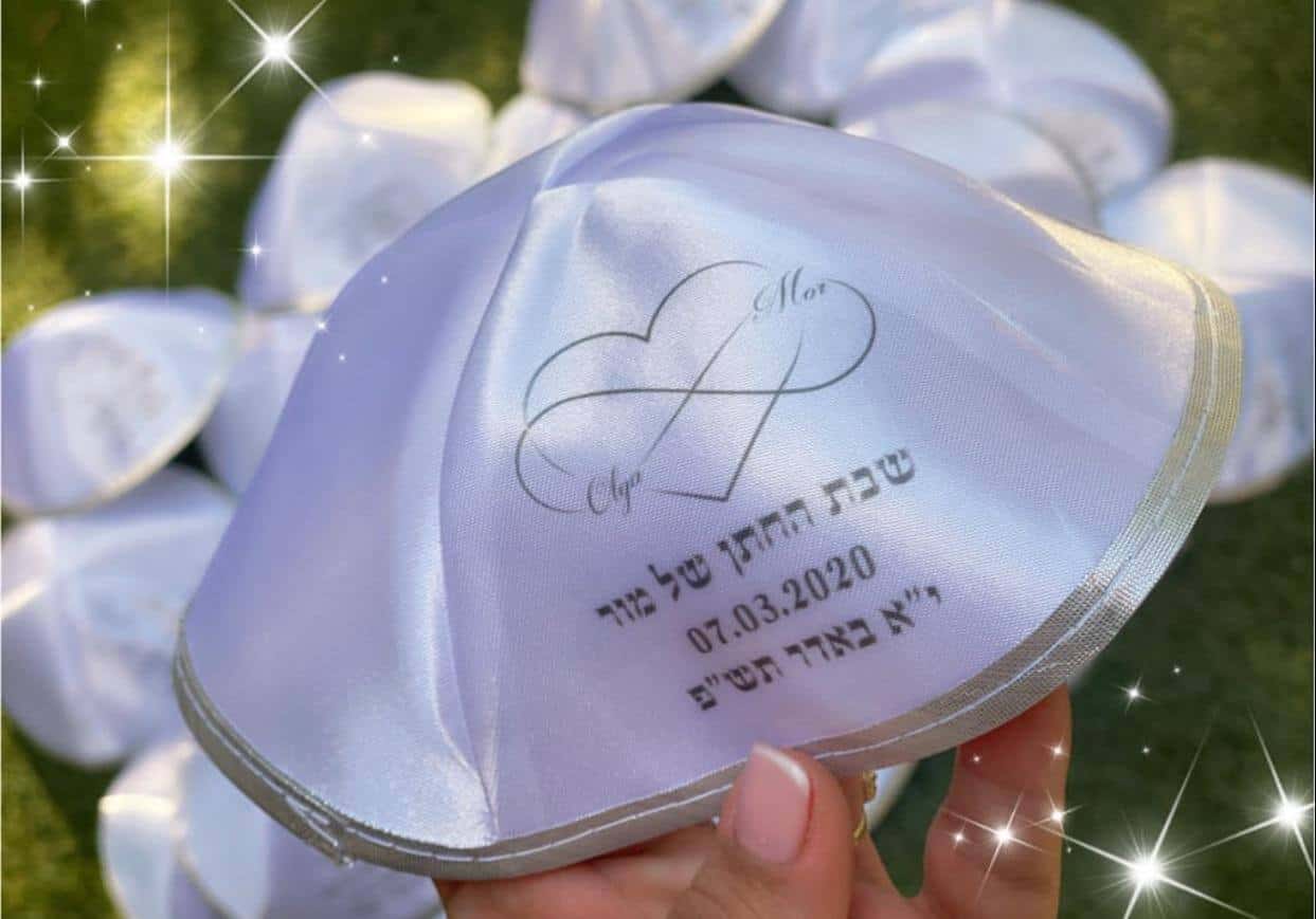כיפות לחתונה ממותגות מודפסות, איכותיות במיוחד, בצבע לבן.