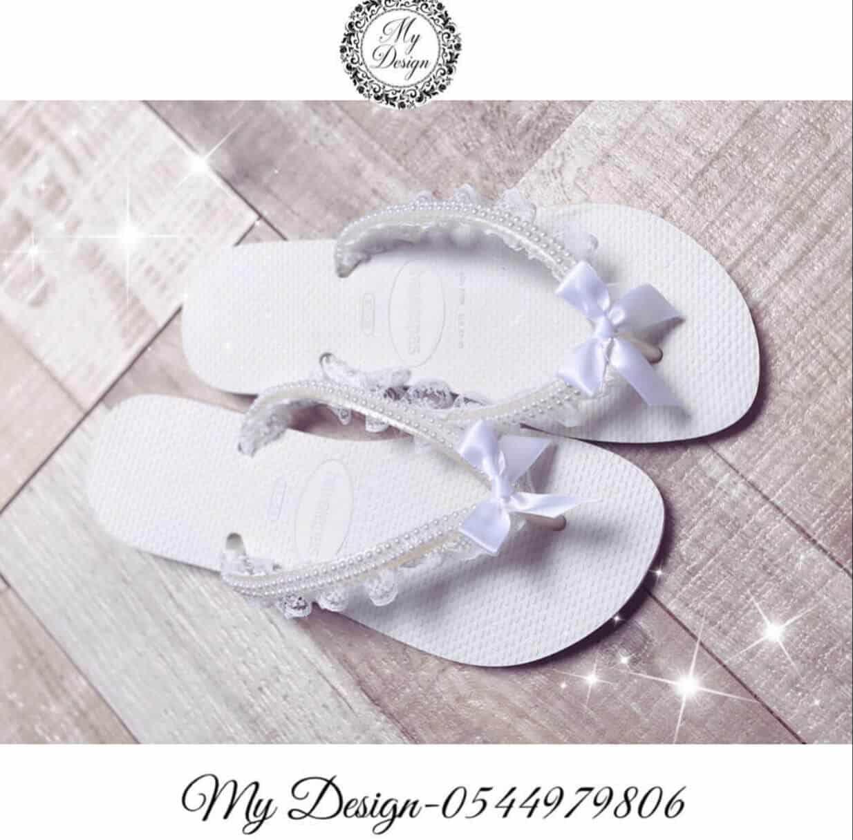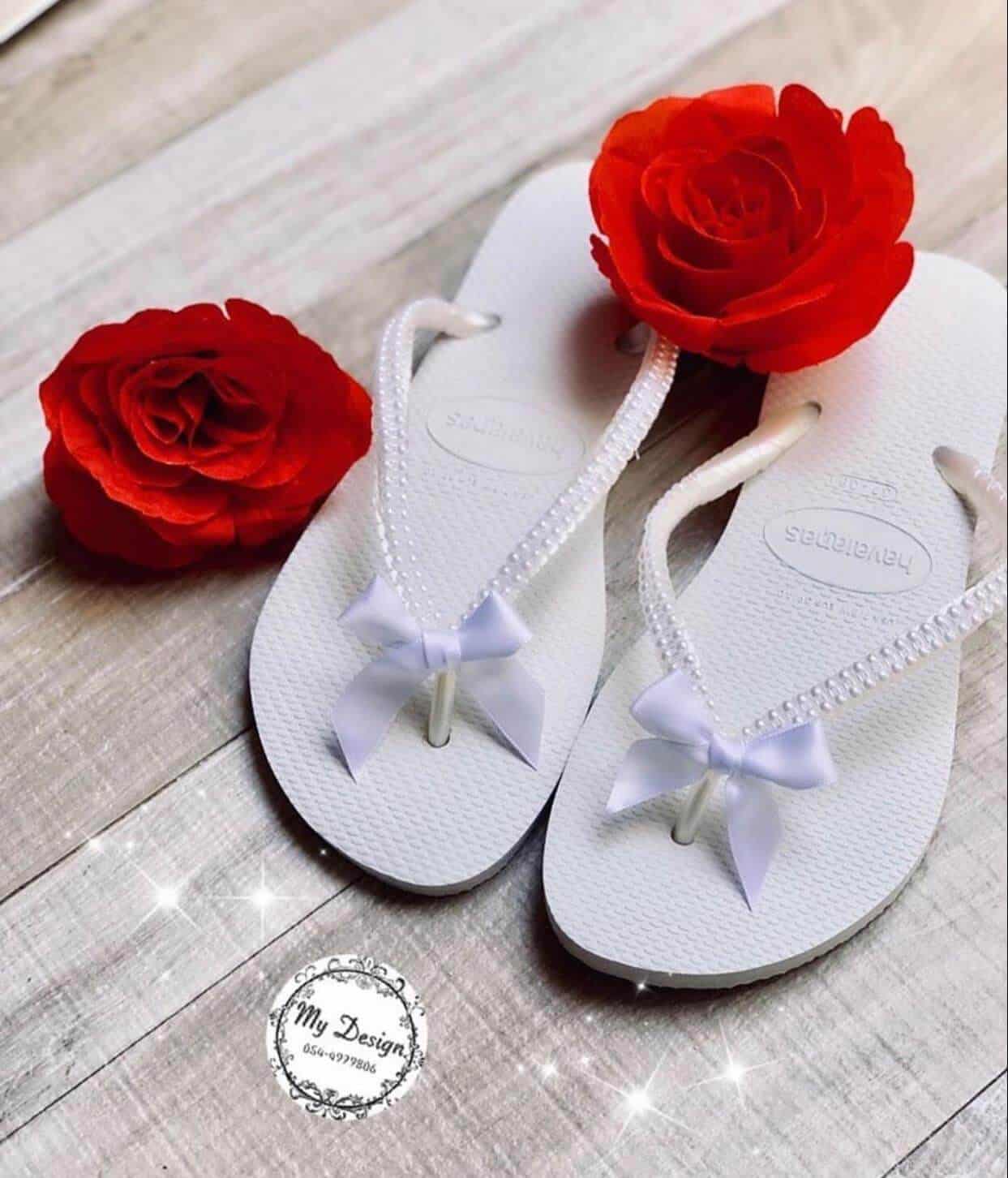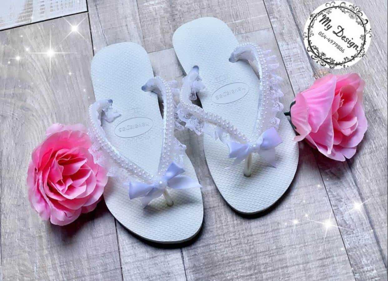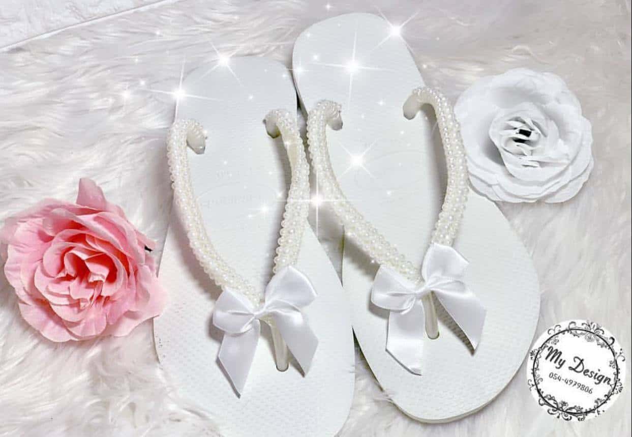 נעליי כלה לבנות בתוספת שזירת פנינים ופפיון סאטן לבן