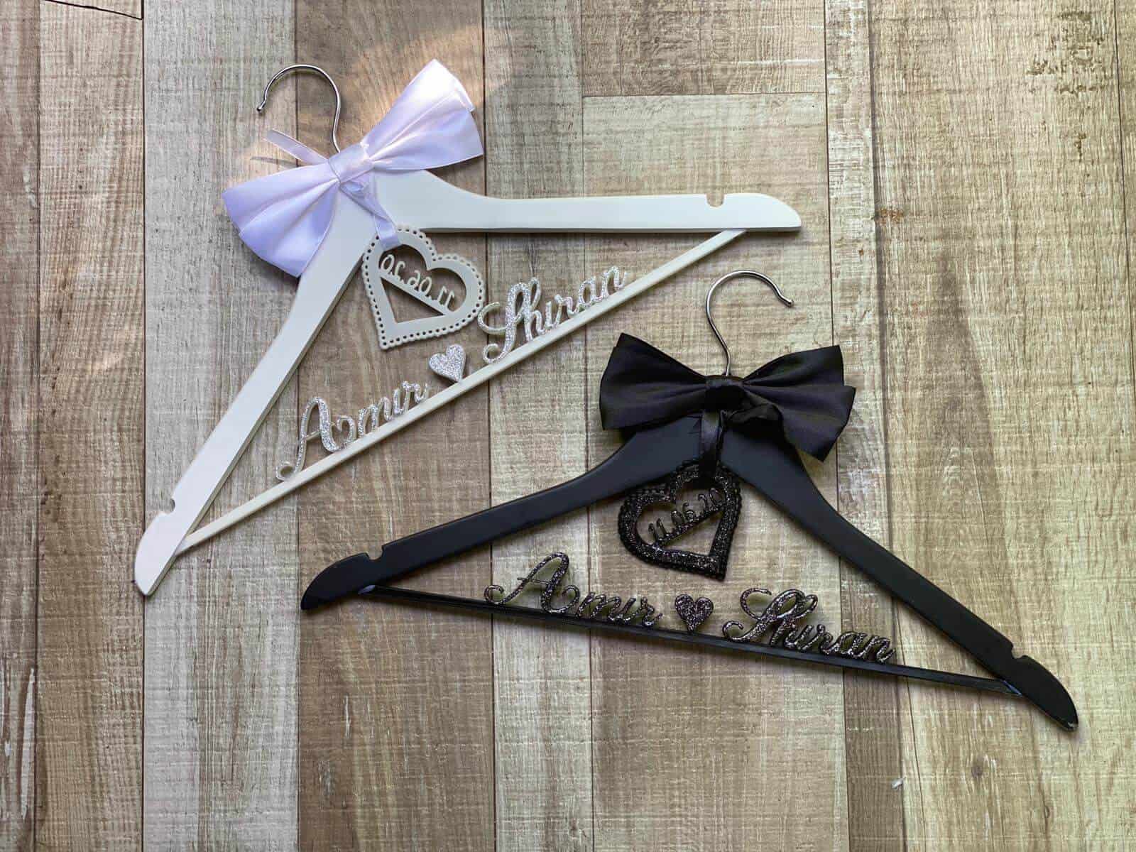 קולב מעוצב במיתוג אישי עם שמות ותאריך החתונה. הקולב מעץ, המיתוג האישי מפלסטיק קשיח בגימור צבע זהב.